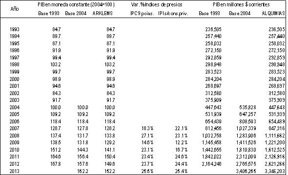 Aun cuando la serie es antigua, parece ser que la base 1993 puede ser usada (o es la mejor alternativa existente) hasta el año 2006. A partir de ese año, la evolución del volumen físico puede seguirse de acuerdo con el cálculo de producto en moneda constante que, realizado por Arkems, goza de credibilidad y llega hasta el año 2013. Nuevamente el problema es conseguir un indicador confiable de la variación en los precios desde el año 2007. Ahí debemos separar el índice a aplicar sobre el consumo privado del resto. Para el consumo privado, parece ser que la mejor opción disponible es el promedio de los índices de precios al consumidor elaborados por 9 provincias y recopilados por CIFRA, CTA. Para el resto, ante la ausencia de mejor alternativa, se utilizaron los índices de precios implícitos del propio INDEC, base 2004. En el cuadro 1 se ofrecen los índices utilizados y el cálculo alcanzado al que denominaremos “alquimias” (nunca más apropiado el nombre).