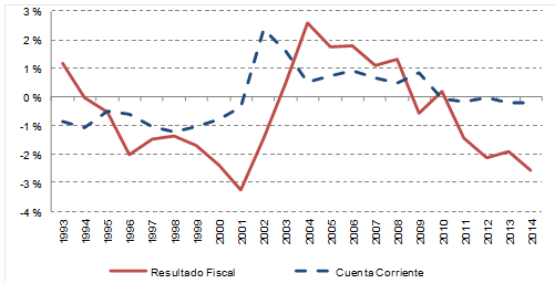 Evolución del Resultado Fiscal y la Cuenta Corriente, 1993-2014 (En porcentajes del PIB)