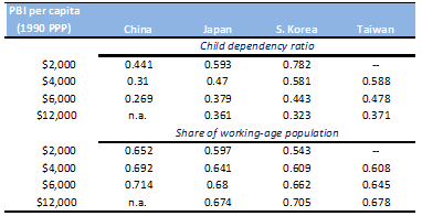 ¿Cuál es el efecto de esta política? Acelerar la caída en la tasa de fertilidad tiene dos efectos. El primero, al reducirse rápidamente la participación de la población pasiva en la población total (debido a la relativa escasez de niños), se anticipa la etapa del dividendo demográfico. El segundo, al achicarse la ventana en la que la tasa de natalidad aventaja a la tasa de mortalidad, se acelera la transición demográfica. Esto último agregó un desafío adicional para la economía asiática en tanto no sólo envejece, sino que también lo hace más rápido que otros países- quizás más rápido de lo que demanda la evolución de su nivel de ingreso. El cuadro 1 exhibe esta situación: en relación a países similares, China vive una transición demográfica prematura. No casualmente el demógrafo Wu Cangping, reflexionando sobre la política de natalidad de China, popularizó a mediados de los ochenta la frase “hacerse rico antes de hacerse viejo.” A cambio, la macroeconomía corroboró las teorías mencionadas: la tasa de consumo privado se redujo marcadamente (pasó de 0.65 a 0.53) a lo largo la década de los setenta y China pasó de ser una economía de ingresos bajos a una de ingresos medios-bajos hacia mediados de la década de los ochenta.