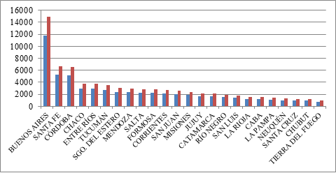 El siguiente gráfico muestra los recursos adicionales que hubieran percibido en 2015 y que recibirían en 2016 cada provincia en caso excluir la retención del 15% de la masa de coparticipación bruta con destino a ANSES. Por ejemplo, Buenos Aires hubiera recibido $11.721 millones en 2015 y recibiría $14.869 millones en 2016. Estos montos prácticamente equivalen al déficit presupuestario proyectado para la provincia en 2015. Santa Fe ($5.279 y $6.697 millones, Córdoba ($5.177 y $6.567 millones) y así cada una.