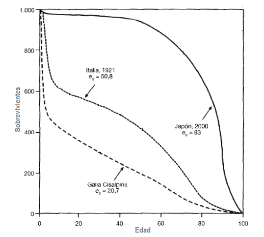 La Figura muestra, a través del desplazamiento de las sucesivas curvas hacia arriba a medida que pasa el tiempo (aunque se trata de poblaciones muy diferentes, podemos tomarlas como representativas de tres momentos en la historia de la humanidad), el progreso en términos de la baja de la mortalidad o, mejor aún, el aumento de la supervivencia.