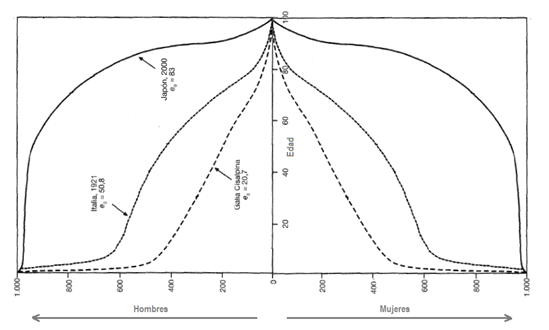 Esto naturalmente nos conduce a la pregunta: ¿cómo es esa estructura etaria? ¿Qué tan joven, o envejecida, es? Sin entrar aquí en el desarrollo formal[g], podemos decir que una población estable tiene una estructura etaria intrínseca, determinada por el perfil de la curva de supervivencia. Si tomamos las curvas de la Figura 1 y las ponemos de costado, midiendo verticalmente hacia arriba la progresión desde la edad 0 en adelante ¡obtendremos las pirámides que esas poblaciones hubieran tenido en una configuración estable o sea, con tasas de fecundidad y supervivencia constantes! (Figura 2)