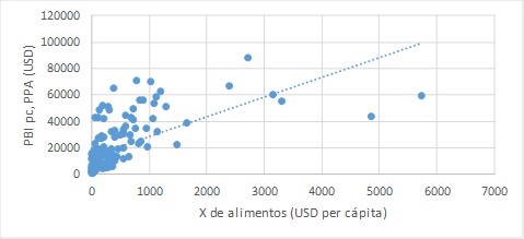Relación entre PBI per cápita (PPA) y exportaciones de alimentos per cápita, 2019