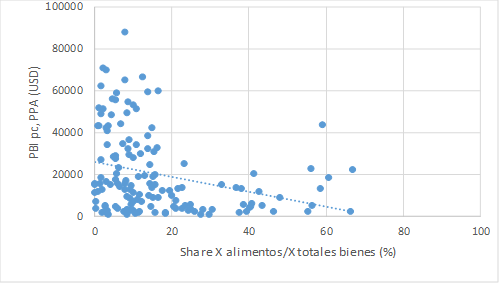 Estas relaciones simples parecen avalar (nuevamente, sin pretensión de generar una prueba rigurosa, sino de ilustrar con estadísticas básicas el fenómeno que estamos analizando), la idea de que mientras que la exportación de alimentos per se no parece estar correlacionada negativamente con el nivel de PBI per cápita de los países (si la relación parece ir hacia algún lado, es en sentido positivo, aunque, de nuevo, esta simple correlación no ofrece prueba suficiente), la dependencia de la exportación de dichos productos (esto es, el peso que los alimentos tienen en la canasta exportadora) podría tener una relación negativa con aquel indicador. En otras palabras, estamos en el mismo terreno que el que surge de la evidencia econométrica antes mencionada: no hay una maldición de los recursos naturales, pero las economías que dependen excesivamente de dichos recursos (en este caso alimentos) podrían verse afectadas negativamente por dicha dependencia.