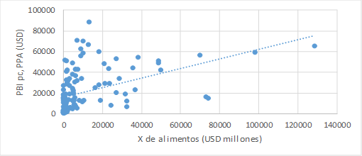 Relación entre PBI per cápita (PPA) y exportaciones de alimentos, 2019