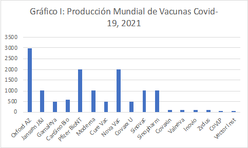 El gráfico I muestra que la capacidad estimada de producción de las diferentes vacunas que se prevé alcanzar en el curso de este año se ubica en los 9 mil millones de dosis. Asumiendo que se necesitan dos dosis por habitante y se cubriría al 70% de la población del planeta, la demanda resultante es de 10,5/11,0 mil millones de dosis.[2] Esta primera aproximación al problema indica un faltante de oferta de 2,0 mil millones de dosis -aproximadamente un 20% de la demanda estaría insatisfecha.