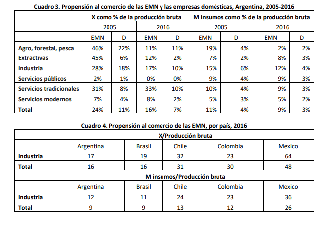 A la vez, entre 2005 y 2016 se produjo una caída consistente de la participación de las EMN en la economía local, más fuerte en extractivas y servicios públicos, pero observada en todos los sectores. También cayó la presencia relativa de las multilatinas argentinas. Esto significa que ganaron terreno las empresas puramente locales, cuya propensión a comerciar es, al menos al nivel de promedios por grupo, menor que la de los otros dos conjuntos de empresas (aunque esta comparación descriptiva requeriría validación a través de ejercicios econométricos en base a microdatos, va en línea con evidencia previa de estudios, tanto locales como internacionales, que utilizan esas fuentes). Al presente, Argentina (y lo mismo vale para los vecinos de América del Sur aquí analizados) se ubica en el grupo de naciones donde el peso relativo de las filiales de EMN sobre las respectivas economías receptoras es menor.