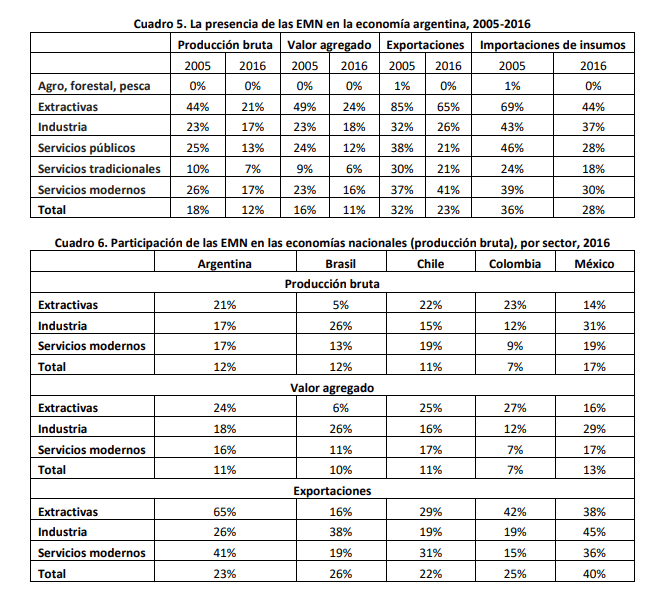 - En la comparación con países vecinos (datos de 2016, cuadro 6), destacamos los siguientes puntos: i) la presencia de las EMN en la industria en Brasil y México es claramente superior a la que tienen en los otros tres países; iii) la presencia relativa de las EMN en servicios modernos en Argentina es similar a la que se observa en Chile y México y mayor a la que se registra en Brasil y Colombia; iii) para el caso de extractivas, se observa el siguiente patrón: en Argentina, Chile y Colombia la presencia relativa de las EMN es mayor a la observada en industria y servicios modernos, mientras que lo contrario ocurre en Brasil y México (donde además el nivel relativo de participación de las EMN en el sector es menor al que existe en los otros tres países); iv) en el agregado de la economía, la presencia relativa de las EMN es similar en Argentina, Brasil y Chile, mientras que en Colombia es algo menor y en México claramente superior (en particular medida en valor de producción); v) en cuanto a exportaciones, mientras que la presencia relativa de las EMN en Argentina es similar a la de Brasil, Colombia y Chile para el agregado de la economía, el caso de México destaca claramente sobre el resto (40% contra 22-26%). Sin embargo, el peso de las filiales extranjeras en la exportación de los sectores extractivo y servicios modernos en Argentina es superior al observado en los otros cuatro países.
