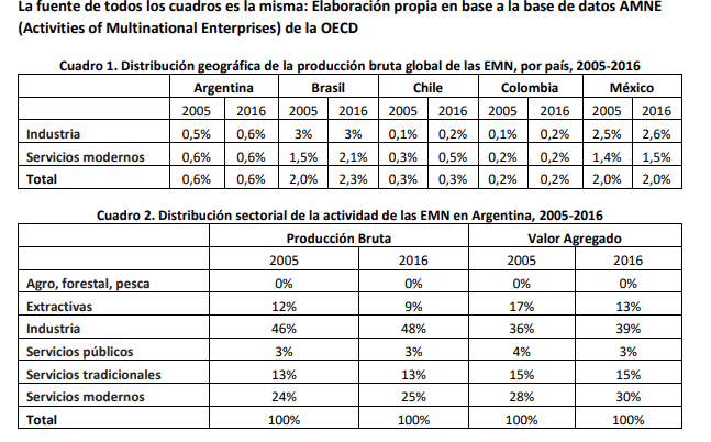 - La Argentina se ubica en el grupo de países con menor peso de las EMN en la producción bruta doméstica. Dicho grupo incluye, además de a los vecinos de América del Sur aquí analizados, a las dos economías más grandes del planeta (EEUU y China), algunos países del Este Asiático (Corea, Indonesia, Japón, Taiwán), Rusia, Turquía y Grecia.
