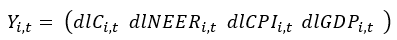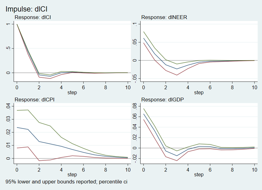 representan las diferencias logarítmicas del índice de precios de commodities (dlC), del tipo de cambio nominal efectivo (dlNEER), del índice de precios al consumidor (dlCPI) y del PIB (dlGDP), respectivamente. ui y eit son vectores de efectos fijos por país y errores idiosincráticos, respectivamente. Se asume que las unidades comparten el mismo proceso subyacente generador de datos con los parámetros de forma reducida A1, A2….. Ap siendo comunes entre ellos. Por lo tanto, estimamos un modelo PVAR(3) utilizando el estimador LSDV, con tres rezagos.