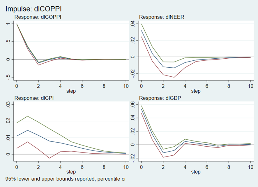 Computamos las funciones impulso-respuesta (IRFs) de un shock de los índices de precios de commodities para evaluar su impacto sobre los índices de precios de: 1) gas natural; 2) petróleo; y 3) productos alimenticios.