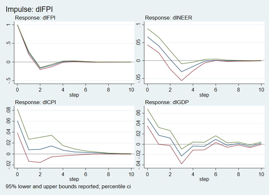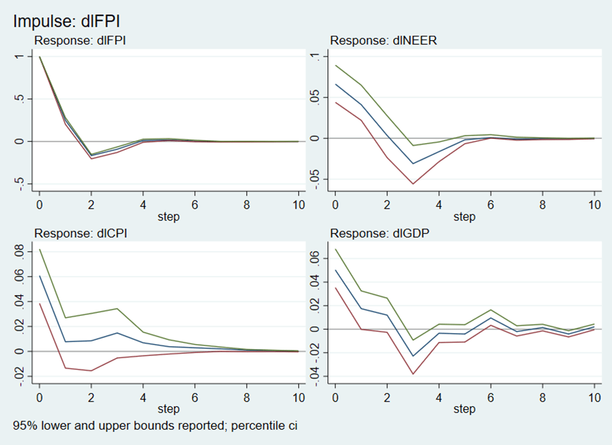 En cuanto al efecto sobre las otras variables cabe destacar lo siguiente. Primero, los shocks tienen un efecto expansivo sobre el producto al inicio, para luego volverse negativo. Segundo, la misma dinámica se observa con el tipo de cambio nominal efectivo, produciendo una apreciación inicial que se combina con una depreciación posterior.