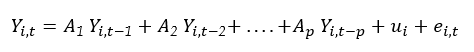 Consideramos un modelo panel VAR de orden p con efectos fijos representado por la siguiente ecuación: