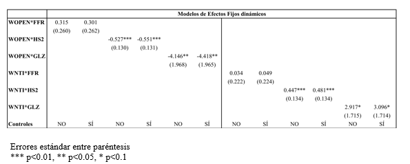 Por otro lado, si se analizan los flujos a la salida de capitales desde países EMDEs hacia los Estados Unidos (ver Tabla 2), se advierte que en ningún caso se obtiene un efecto significativo de la interacción. Esto aplica para WOPEN y para WNEO¾controles a la salida de capitales.