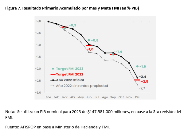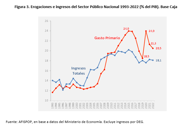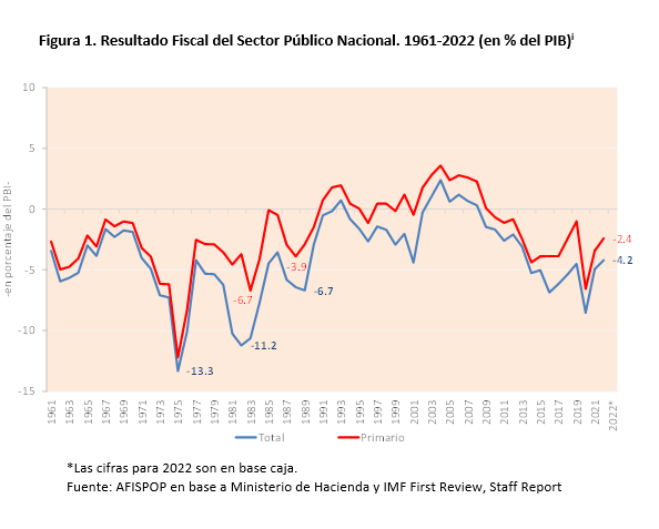 El Sector Público Nacional cerró el año 2022 con un déficit primario, en base caja, equivalente a 2,4% del PIB. En consecuencia, se ha logrado sobre cumplir levemente la meta anual acordada oportunamente con el FMI, lo que significa un alivio en términos del manejo de la crisis en el corto plazo, pero sigue mostrando una situación estructuralmente compleja.