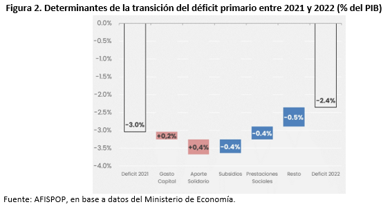 La reducción del déficit primario en 2022 estuvo principalmente liderada por menores gastos en subsidios y en prestaciones sociales, que más que compensaron el incremento del gasto de capital y la ausencia del Aporte Solidario, ocurrido en 2021. Las menores transferencias a CAMMESA (en parte producto de la segmentación tarifaria) y al Plan Gas, explicaron gran parte la reducción de la partida de subsidios (a la energía) que en su totalidad se redujeron 0,4% del PIB. En segundo lugar, el total de prestaciones sociales se contrajo en relación con el producto en 0,4 puntos porcentuales (pp), principalmente como resultado del actual mecanismo automático de indexación y la aceleración inflacionaria en la segunda mitad del año 2022. Vale mencionar que esto ocurrió aun considerando un amplio paquete de bonos extraordinarios (“no remunerativos”) para distintos grupos de beneficiarios (i.e. jubilados de menores ingresos, informales, monotributistas y adultos sin ingreso). El resto (0,5% del PIB) se compone de distintos ajustes discrecionales menores sobre la mayoría de las partidas presupuestarias, sensiblemente afectadas por la aceleración inflacionaria y el estricto manejo de caja. Por el contrario, solo dos ítems contribuyeron negativamente al resultado fiscal, esto es, expandiendo el déficit comparativo con 2021. En primer lugar, el gasto de capital del SPN, en base caja, se incrementó en 2022 y pasó de 1,4% del PIB en 2021 a 1,6% del PIB en 2022. En segundo lugar, el Aporte Solidario, que contribuyó con cerca de 0,4% del PIB en 2021, no estuvo presente en 2022, incrementado así el esfuerzo fiscal implícito durante el año pasado (Figura 2).