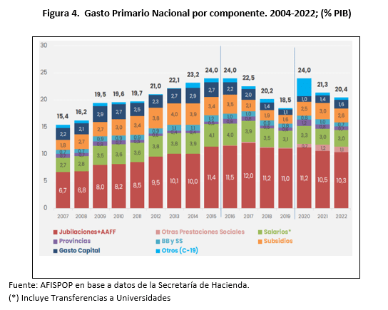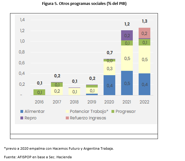 El segundo aspecto para destacar en relación con el resto de las partidas tiene que ver con la introducción de nuevos programas sociales y el crecimiento de otros ya existentes (Figura 5). Dejando de lado los programas de vigencia transitoria, estrictamente destinados a la emergencia del COVID-19 (i.e. ATP e IFE), la sumatoria de otros programas sociales como la Tarjeta Alimentar, Potenciar Trabajo, Progresar, Refuerzo de Ingresos y Repro, llegaron a representar en 2022 el equivalente a 1,3% del PIB. Independientemente de su eficacia y necesidad, lo cierto es que estos gastos se presentan como una nueva demanda social que atender por parte de un presupuesto público sensiblemente condicionado. Sin embargo, vale aclarar que estos gastos, a diferencia del resto de las prestaciones sociales, no han sido formalmente indexados, lo cual los hace relativamente menos rígidos que el resto.