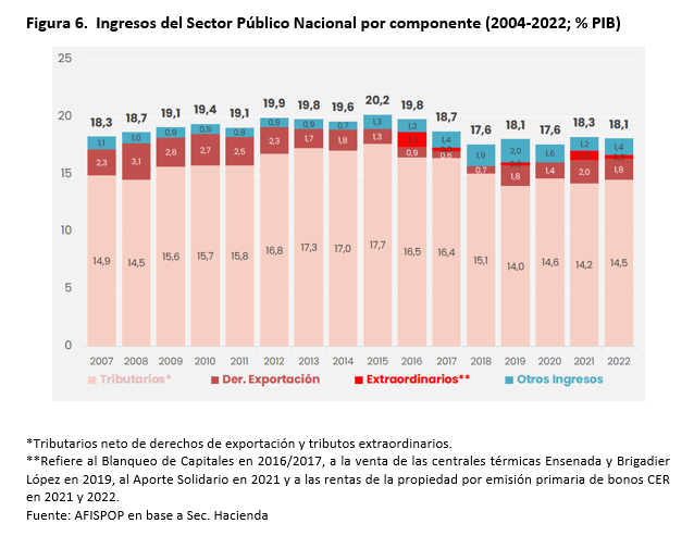 En este contexto, el manejo de los recursos del SPN en los últimos años ha estado signado por la imposición de distintas medidas de carácter extraordinario. Haciendo un breve racconto desde 2016 a esta parte, se pueden destacar el Blanqueo de Capitales en 2016/2017, el registro de ingresos por la asignación de DEGs del FMI en 2021, el Aporte Solidario en ese mismo año, la importancia de las rentas de la propiedad producto de la emisión primaria de bonos CER en 2021 y 2022[3] -registradas por arriba de la línea-, las ventas de empresas públicas[4] y transferencias del FGS (Fondo de Garantía de Sostenibilidad) de la ANSES para financiar la Reparación Histórica en 2019, entre otros.