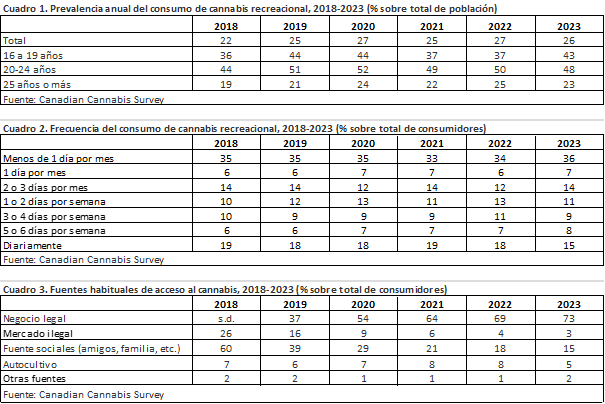 En cuanto a los datos oficiales, la información más reciente proviene del Canadian Cannabis Survey (CCS). La ventaja de esta fuente es que llega hasta 2023, pero dado que los primeros datos son de 2017-18 (su lanzamiento estuvo asociado a la legalización y la necesidad de monitorear sus efectos) tiene limitaciones a la hora de utilizar métodos econométricos, ya que la serie disponible es muy corta. Por ello, algunos de los (pocos) estudios que utilizan ese tipo de metodologías para el caso canadiense se basan en otras fuentes que cuentan con datos de más largo plazo, como el Canadian Alcohol and Drugs Survey (CASD). Sin embargo, la última información disponible de esta fuente corresponde a 2019 (se hacen encuestas con frecuencia bianual y no hay aun datos sobre la de 2021); por otro lado, a lo largo del tiempo han ocurrido cambios en la metodología y las preguntas incluidas en esta encuesta, lo cual dificulta las comparaciones intertemporales. Otras fuentes de datos son el Canadian Community Health Survey (CCHS) –cubre la población mayor a 12 años-, el National Cannabis Survey (NCS) –mayores de 18 años- y el Canadian Student Tobacco, Alcohol and Drugs Survey (CSTADS) –cubre estudiantes secundarios- (el CCS se aplica a mayores de 16 años y el CASD a mayores de 15 años).