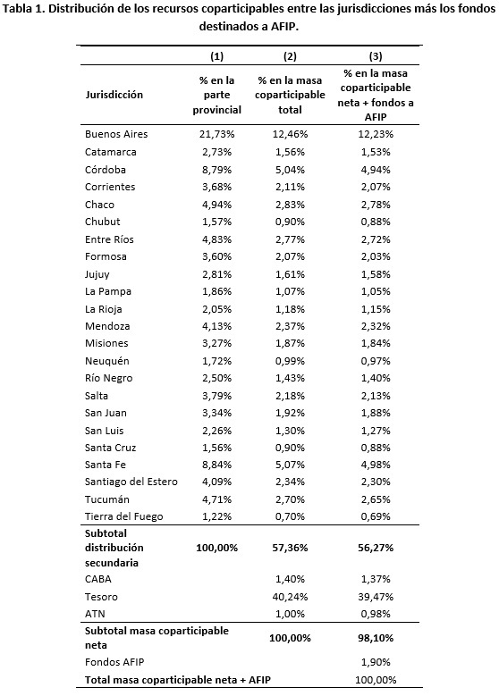 Para ejemplificar la importancia relativa de estos recursos en los impuestos coparticipables se parte de la última ley sancionada en 1988 (ley 23548) con el agregado de la participación de Tierra del Fuego y de la Ciudad Autónoma de Buenos Aires (cuya parte se nutre de la participación de la Nación). En la tabla 1 se presenta la información relevante. En la columna 1 se incluyen los porcentajes de participación en la distribución secundaria que surgen de la ley 23.548. La columna 2 presenta la participación de las provincias en la masa coparticipable total incluyendo CABA, Tesoro y Aportes del Tesoro Nacional. La columna 3 muestra la distribución efectiva considerando la participación de la AFIP que no está explicitada en la Ley de Coparticipación [3][4].
