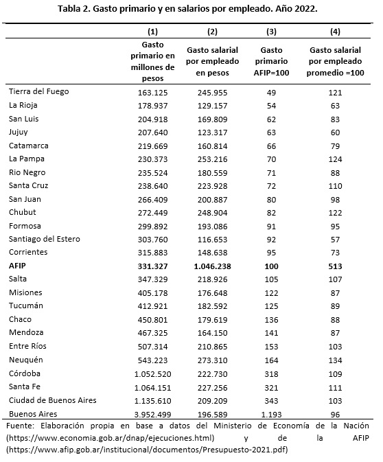 En la tabla 2 se presenta una comparación de los gastos primarios ejecutados en 2022 y de los gastos salariales por empleado en las provincias y la AFIP. Un resultado destacable es la gran diferencia de gasto en personal por ocupado que en AFIP alcanza el valor máximo, 5,23 veces superior al promedio de la muestra y en La Rioja el valor mínimo, 37% inferior al promedio. La situación se repite en el resto de las provincias. Estas diferencias son explicadas, por un lado, por la gran disponibilidad de fondos de la AFIP y, por otro lado, por las diferentes intensidades de uso de factores (las provincias proveen bienes intensivos en trabajo como educación, seguridad, justicia, salud).