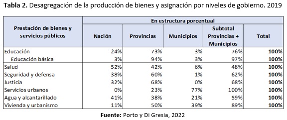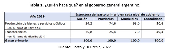 De la Tabla 1 resulta que el sector público cuenta con dos niveles especializados. El Nacional en el pago de transferencias (75,8% de su gasto) y el Subnacional (provincias y municipalidades) en la producción de bienes públicos, 74,6% en las provincias y 93% en las municipalidades.