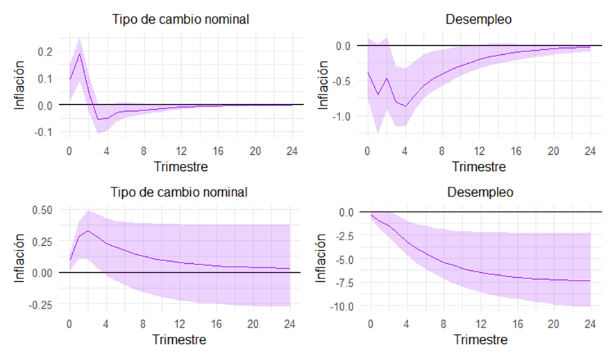 Dicha relación es sólo estadísticamente significativa una vez que tomamos en cuenta el tipo de cambio como variable endógena. Es interesante observar también que un incremento de la tasa de devaluación de 1 pp conlleva un efecto inflacionario de corto plazo de aproximadamente 4 trimestres, volviéndose no significativo luego, mientras que aumenta el desempleo en 0,4 pp en el largo plazo. Esto último implica que encontramos que las devaluaciones se relacionan a aumentos del desempleo y se corrobora la hipótesis de devaluaciones contractivas.