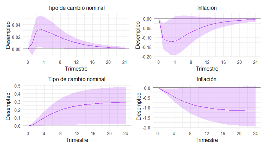 Nota: t=0 es el momento del shock. El área sombreada en violeta representa las bandas de confianza del 90%. La línea violeta sólida denota la respuesta de la tasa de desempleo a los diferentes shocks..