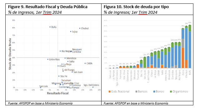 Para completar la descripción de las finanzas públicas provinciales, conviene complementar con estadísticas de deuda pública, permitiendo capturar la dimensión temporal del asunto. Esto es, cruzando datos de déficit fiscal con stock de deuda, nos permite de alguna manera saber el pasado reciente y el estado actual de las cuentas públicas, toda vez que la deuda pública no es otra cosa que el resultado de desbalances previos. En este sentido, la Figura 9 es elocuente y permite rescatar algunas caracterizaciones provinciales.