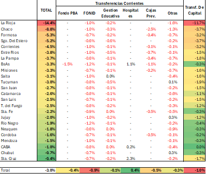 Al desagregar las transferencias presupuestarias del gobierno nacional a las provincias, se observa que el recorte ha sido generalizado (Tabla 1). Pero nuevamente, mientras el impacto agregado promedio explicó una merma para las provincias equivalente al 3% de sus ingresos, existen casos extremos como La Rioja que vio reducido sus ingresos (en términos reales) cerca de 14% solo por el canal de este tipo de transferencias, mientras que, en el otro extremo, Santa Cruz tuvo recortes menores a 0,4% de sus ingresos. Respecto a la composición de estos fondos, el principal recorte ha sido en las transferencias de capital a provincias, siendo la provincia de La Rioja por lejos la más afectada, nuevamente.