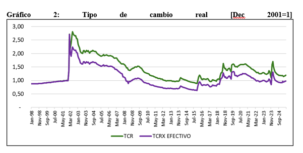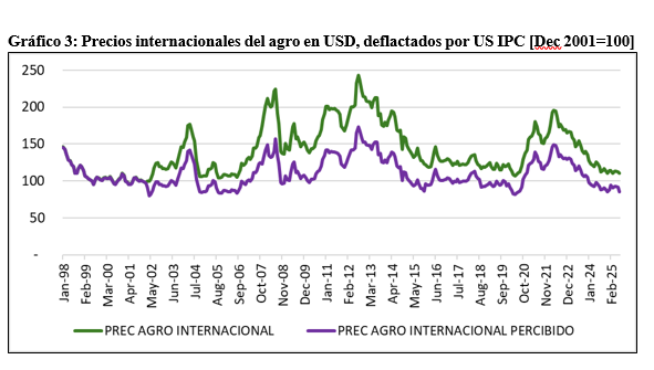 A partir de 2003, el tipo de cambio real comenzó a bajar. El tipo de cambio nominal permanecía prácticamente congelado, pero los precios continuaban subiendo. Para 2009, el tipo de cambio real efectivo para los exportadores era más bajo que al final de la Convertibilidad, a pesar de que el tipo de cambio real general seguía siendo mucho más alto. Sin embargo, esto no implica necesariamente que la rentabilidad del agro fuera menor: también deben considerarse los precios internacionales, lo cual se analiza más adelante en esta sección.