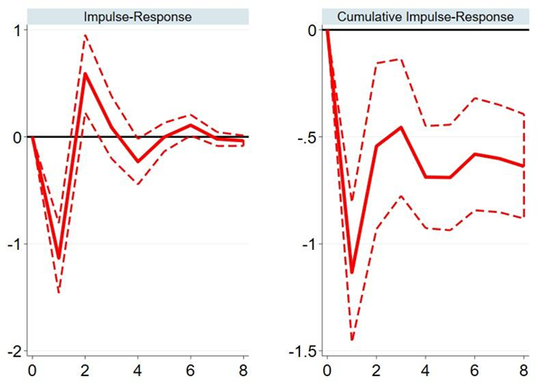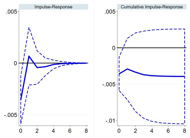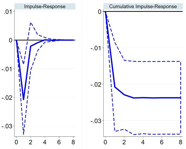 El Gráfico 4 muestra que un aumento en las retenciones a las exportaciones de carne tiene un efecto negativo sobre los precios internos, tal como lo señala buena parte de la literatura. Sin embargo, es importante destacar que este impacto es significativo únicamente en el período contemporáneo al shock, es decir, en el mismo momento en que se aplican las retenciones. Esto implica que el efecto “virtuoso” de esta política es limitado y transitorio.
