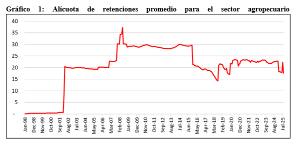 Bajo la presidencia de Alberto Fernández, las retenciones agropecuarias volvieron a aumentar. La tasa promedio osciló entre el 20% y el 24%, según la ponderación del mes. Finalmente, durante el gobierno de Javier Milei hubo descensos en carnes (de 9% a 6.75% en bovina y aviar; quita total en porcina), implementados a mediados de 2024 y una baja temporal en granos, anunciada en enero de 2025, que tendría vigencia hasta fines de junio del mismo año. En esa ocasión se bajó la alícuota en soja de 33% a 26%, en subproductos de la soja de 31% a 24.5% y en maíz, trigo y cebada de 12% a 9.5%. La tasa promedio, en consecuencia, bajó desde 20%-24% hasta 17%-18%. En julio, tal como había sido anunciado, la rebaja temporal expiró y las alícuotas volvieron a subir, elevando una vez más la tasa promedio. No obstante, el presidente, a finales de ese mes, ante el reclamo de las entidades rurales, anunció que se reestablecían las alícuotas relativamente bajas de enero-junio, ahora sí de manera permanente. Por otro lado, añadió además un nuevo descenso en carnes bovina y aviar, que llevó la retención en esos productos, hasta el 5%.